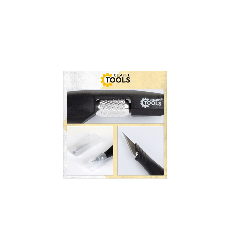 Every Warhammer hobbyist needs a hobby knife, so the Citadel Tools design team created one just for them. It features a fully sculpted hard plastic handle, and incorporates a number of clever features for safety and convenience: