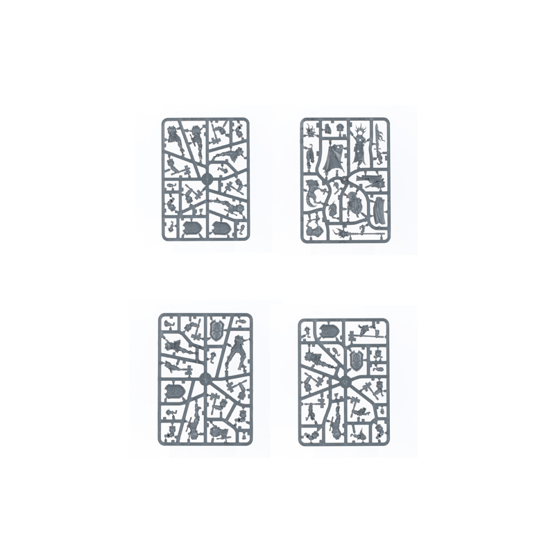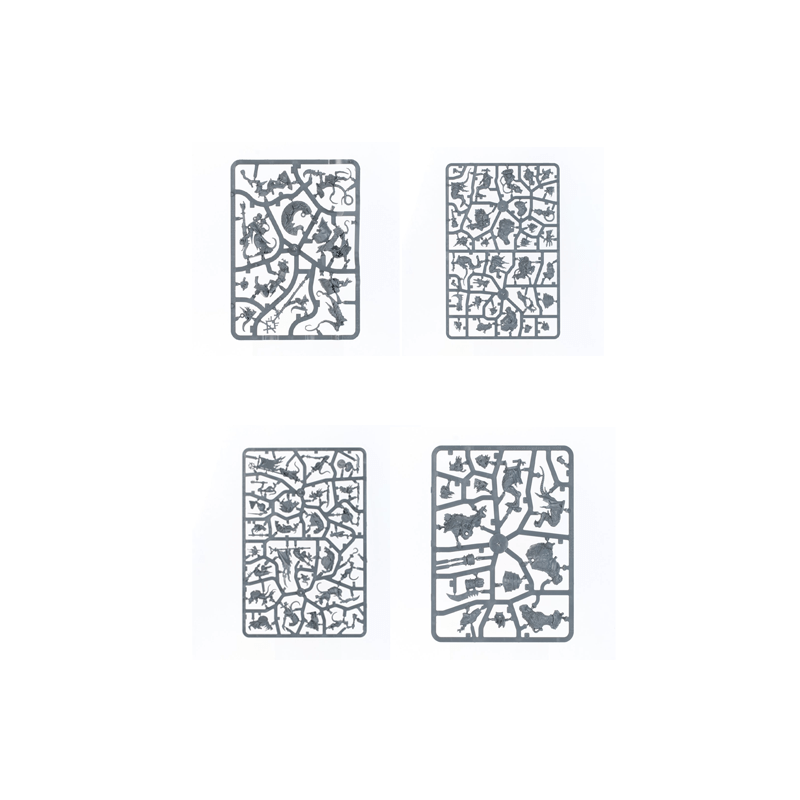 This kit comes supplied with 3x Citadel 32mm Round Hex Hole Bases, 3x Citadel 50mm Round Hex Hole Bases, 9x Citadel 40mm Round Hex Hole Bases, and 20x Citadel 25mm Round Hex Hole Bases. These push-fit miniatures can be assembled without glue, and are supplied unpainted – we recommend using Citadel Colour paints.