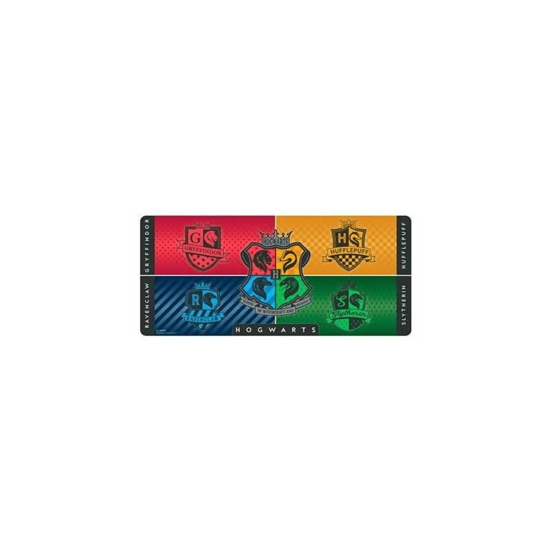 The Harry Potter Hogwarts Shields XXL Gaming Mat features iconic house crests, perfect for adding magical flair to your gaming setup or simply to protect your desk.