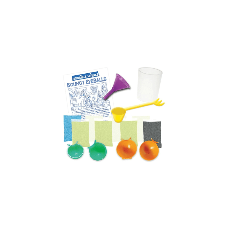 Make eyeballs that bounce, find out how balls bounce and learn jazzy juggling. Make one large eyeball and three small glow-in-the dark eyeballs. Contents: 8 packs of crystals, large mould, small mould, plastic pot, funnel, measuring spoon and "Horrible Info" leaflet Suitable from 8 yrs+