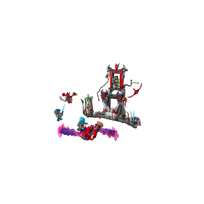 The Dragonians’ hideout includes a cage to detain ninja characters, a retractable bridge, a pit with for the ninja to fall into with a skeleton, a climbing rope so the ninja can escape and a spinner toy with space for 2 characters to sit inside and knock over enemies.