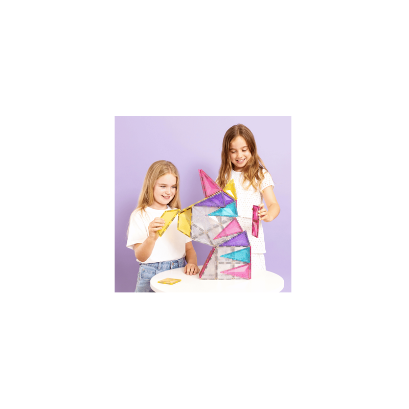 Designed for the unicorn lovers, fantasy dreamers and creative explorers, this pack is filled with delightful play possibilities. Featuring a stunning combination of glitter magnetic tiles in dazzling clear and vibrant bright colours of pink, yellow, teal and purple, plus a thoughtful selection of shapes in squares, hexagons, rectangles, triangles and trapezoids to bring your sparkly unicorn creation to life!
