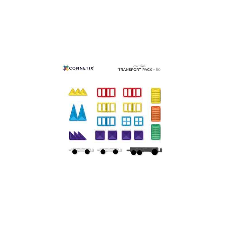 Designed with vehicle enthusiasts in mind, this pack takes magnetic tile play up a gear! Featuring our iconic REVERSIBLE transport base, two clear motion bases with REAL rubber wheels, plus a range of magnetic tile shapes, the CONNETIX 50 Piece Rainbow Transport Pack allows you to imagine and create endless vehicle designs.