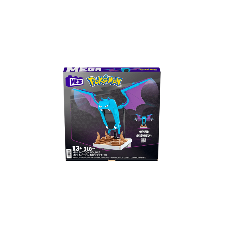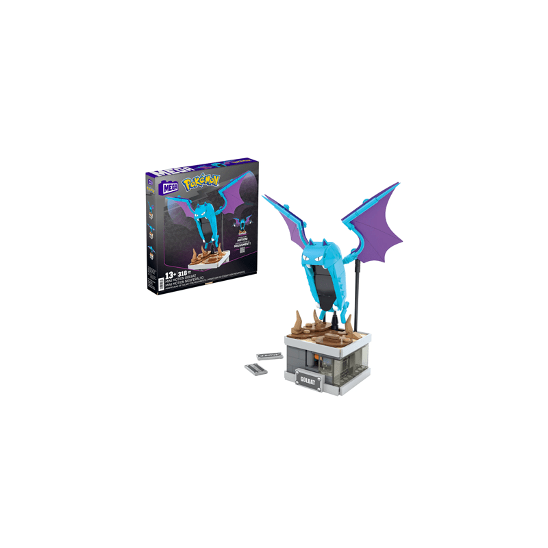 Experience the dynamic charm of the Mega Showcase Pokémon Mini Motion Golbat, a compact 5-inch model designed for collectors and enthusiasts. Construct the detailed Golbat figure and activate its hidden button to see its wings flap realistically, bringing your display to life. Perfectly sized for desks or bedside tables, this set complements other Mini Motion and standard Motion collections, allowing you to build an impressive Pokémon showcase with MEGA. Elevate your collection with expert craftsmanship and interactive design in a space-saving form.