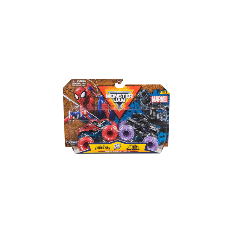 Charge into thrilling Monster Jam and Marvel Heroes battles with the official Marvel Monster Jam 1:64 scale die-cast truck 2-Packs! These sets star Marvel's iconic heroes, such as Spider-Man Vs. Black Panther, and the invincible Iron Man Vs. War Machine! Crafted for Super Hero fans, each truck in the 2-Pack is a detailed marvel with authentic BKT Tires, vivid stylized rims, and a chassis that’s ready for Monster Jam action.