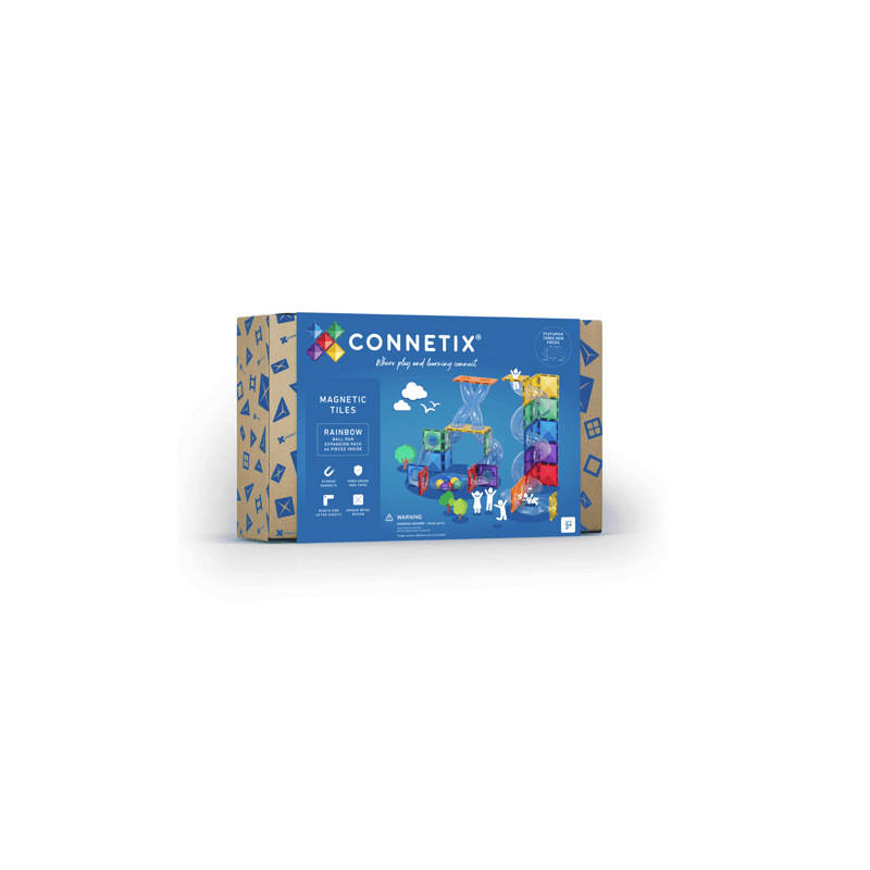 Take your ball run creations to a whole new level with whirling and twirling, unexpected diversions and double the fun! Featuring exclusively designed, clear, fluted tubes including Spiral, “X”, double-bowl pieces, as well as vibrant rainbow connector square magnetic tiles and wooden balls, the CONNETIX 66 Piece Rainbow Ball Run Expansion Pack is sure to challenge your inner engineer to create bigger, more exciting designs.