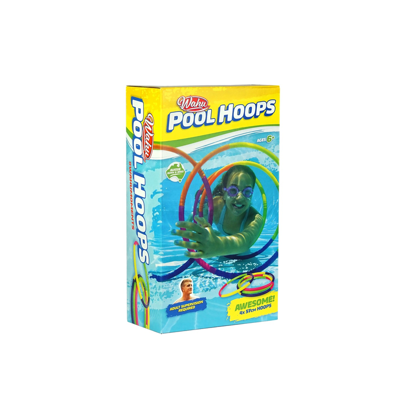 Create your own course or race against friends. Wahu Pool Hoops are designed to sink and stand upright at the bottom of the pool, try swimming through them before they hit the bottom. Includes 4 Multi-coloured hoops. AGE 6+